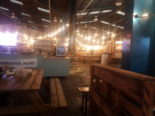 Indoor street food market, some seating outside. Spaces for car parking. Lots of different things to try, only a handful of beers on sale. We'll worth a visit.